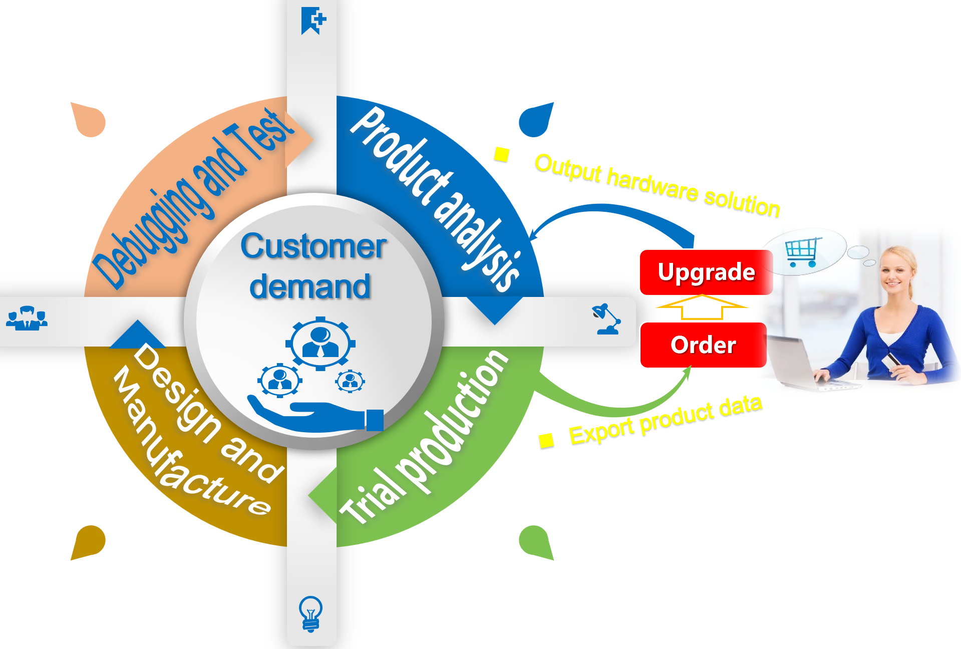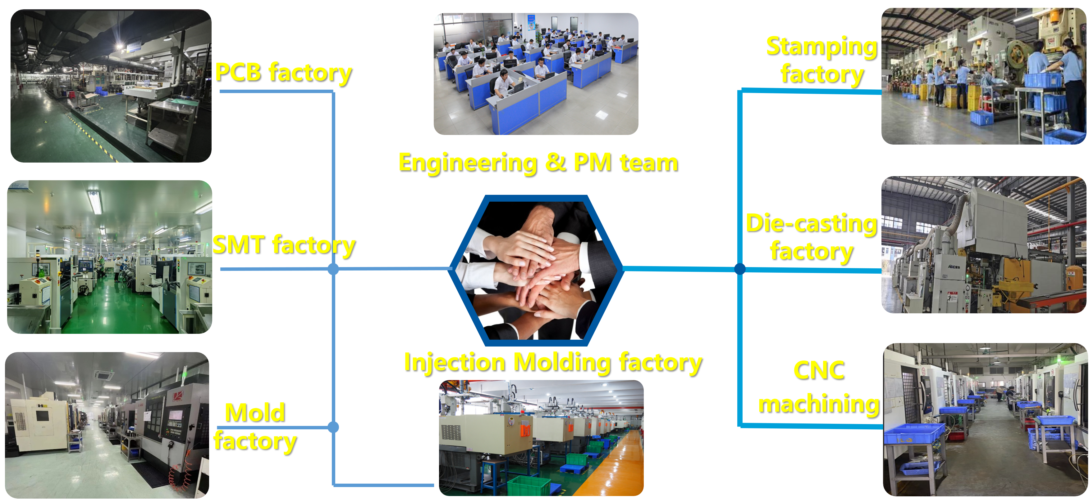 including Industrial design, Mechanical design, PCB design and software development; Plastic molds, Stamping molds and Die-casting molds, and the parts are manufactured through these molds;