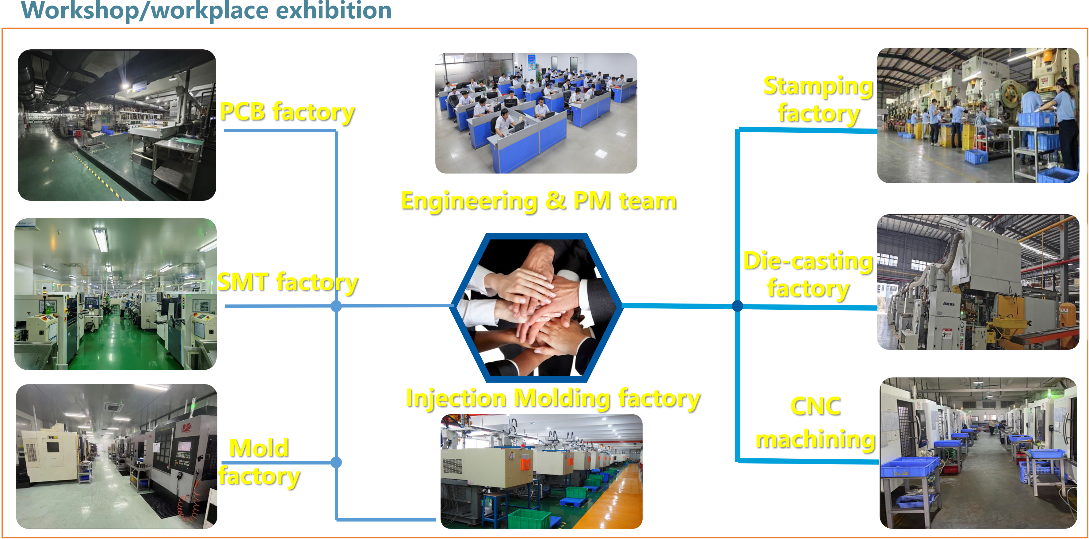 high-quality, cost-effective and flexible complete product solutions at a competitive overall cost, including Industrial design, Mechanical design, PCB design and software development; Plastic molds, Stamping molds and Die-casting molds, and the parts are manufactured through these molds; CNC machining, PCB manufacturing and PCB assembly, Logistics and freight forwarding and etc.